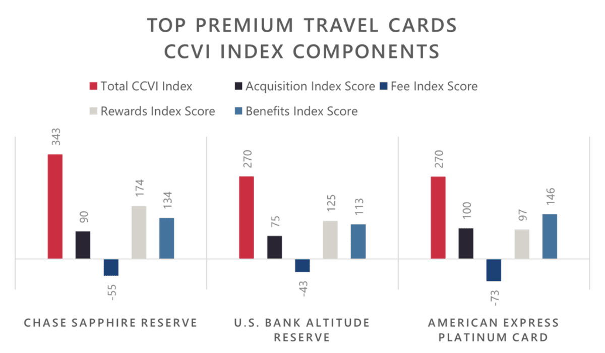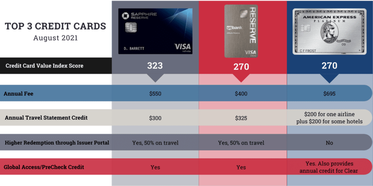 Each month, we calculate the scores for the four components to develop a single Credit Card Value Index score. While the Sapphire Reserve Card has consistently ranked in the top five credit cards, the new benefits and more generous accelerated rewards on travel and dining booked through Ultimate Rewards helped propel it to the top spot in the latest update. The card closely competes with American Express’ Platinum Card and U.S. Bank’s Altitude Reserve Infinite card.